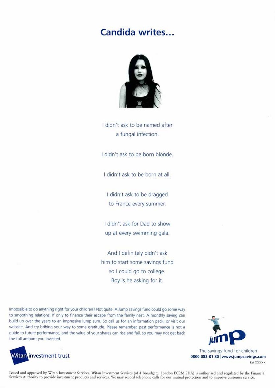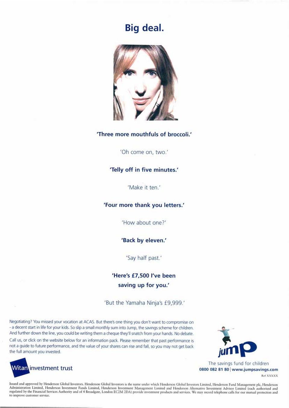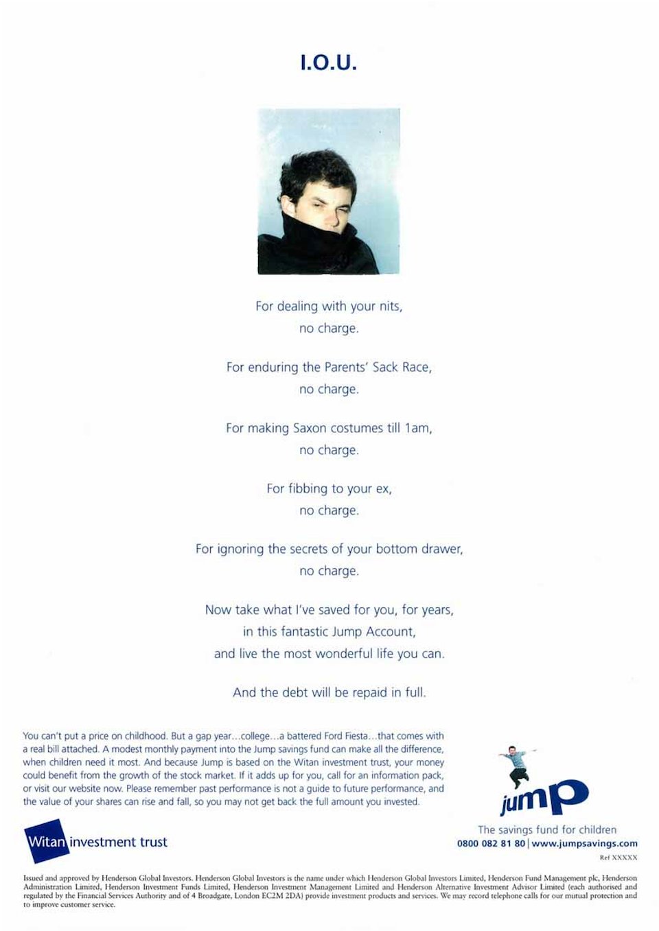 Financial ads are notoriously same-y. To persuade parents to save on behalf of their children, we adopted a different tack. Painting the picture of the stresses and strains of real family life, in distinctly unstuffy language. By getting under the skin of those relationships, we show the situations where a savings habit can come to the rescue. This campaign won “Money Marketing Campaign of the Year”.